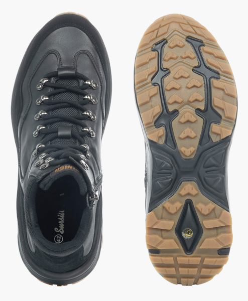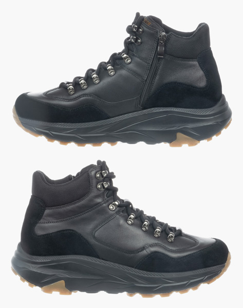 Верх из гладкой черной натуральной кожи в сочетании с вставками из нубука, текстильный манжет в области голеностопа - все детали создают актуальный продуманный образ. Застежка на молнии с внутренней стороны в дополнение к шнуровке  значительно повышает удобство надевания. Текстильная подкладка обеспечивает комфортное тепло в прохладную погоду. Анатомическая стелька с выраженной поддержкой сводов способствует распределению нагрузки на ноги и снижению усталости при ходьбе. Голеностоп надежно удерживается от завала плотным задником. Модель очень легкая благодаря подошве из вспененного материала ЭВА,который еще и отлично амортизирует.  а противоскользящий протектор обеспечивает устойчивость даже на скользких поверхностях. Подошва имеет перекатный профиль, что особенно полезно для людей, много времени проводящих на ногах. Такая подошва формирует физиологически правильную походку и снижает усталость.