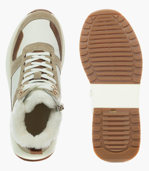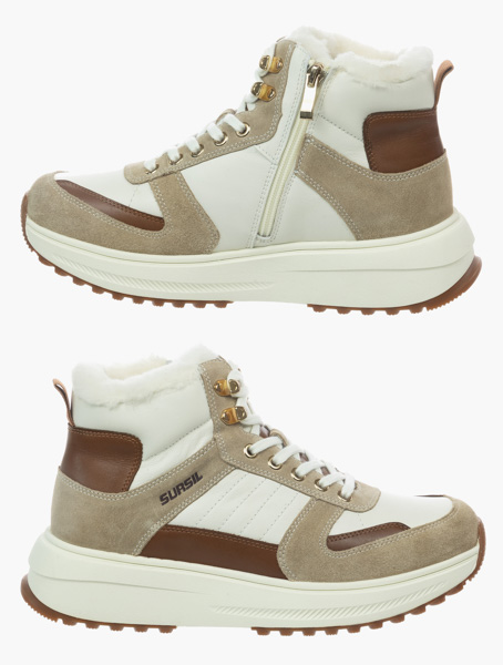 Верх из натуральной кожи белого цвета в сочетании с нубуком светлых и темных оттенков бежевого, дополненный сливочно белой подошвой с каучуковым протектором - образец актуального стиля в сочетании с комфортом. Белая шерстяная подкладка и покрытие стельки обеспечат ногам тепло при минусовых температурах. Застежка на молнии с внутренней стороны в дополнение к шнуровке значительно повышает удобство надевания. Анатомическая стелька с выраженной поддержкой сводов способствует распределению нагрузки на ноги и снижению усталости при ходьбе. Голеностоп надежно удерживается от завала плотным задником. Модель остаточно легкая благодаря подошве из вспененного материала ЭВА, который еще и отлично амортизирует, а противоскользящий протектор обеспечивает устойчивость даже на скользких поверхностях. Подошва имеет перекатный профиль, что значительно снижает усталость при длительной ходьбе.