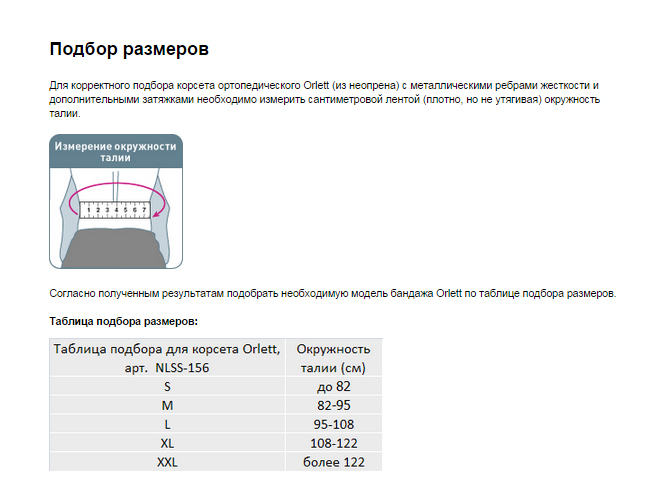 Для корректного подбора корсета ортопедического Orlett (из неопрена) с металлическими ребрами жесткости и дополнительными затяжками необходимо измерить сантиметровой лентой (плотно, но не утягивая) окружность талии.